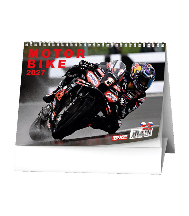 Stolní kalendář Motorbike A5 2027, Kalendárium: měsíční fáze, roční období, letní a zimní čas, místo na poznámky, řádkový měsíční přehled; Informační stránky: státní svátky, ostatní svátky a významné dny CZ/SK, tabulkový kalendář aktuálního a následujícího roku; Popis: Stolní kalendář s týdenním kalendáriem pro milovníky rychlých motorek. s kalendáriem České + slovenské týdenní jmenné /CZ+ SK weekly/CZ+SK wöchentlich