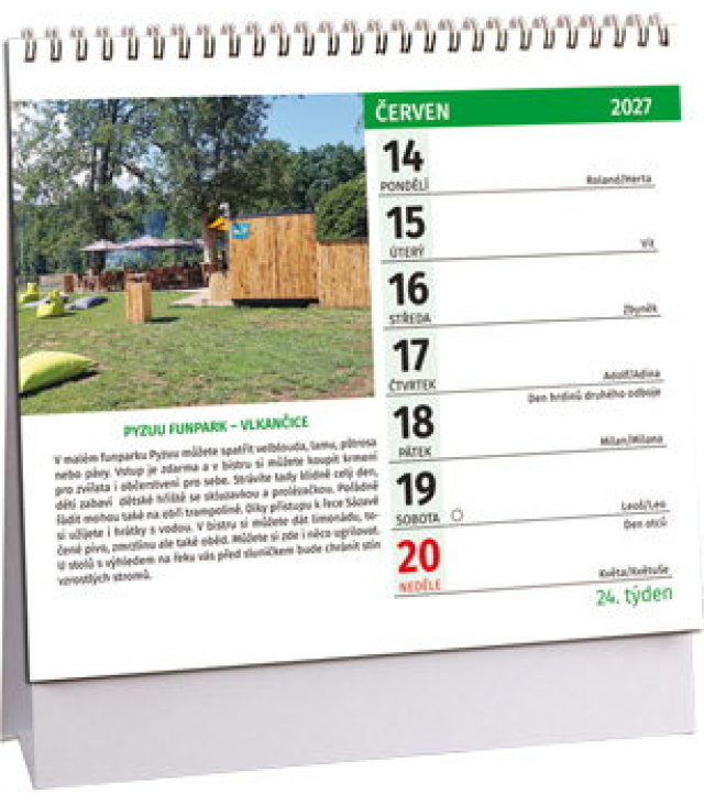 Stolní kalendář Tipy na výlety mini 2027, Kalendář obsahuje: fáze měsíce; seznam jmen, plánovací kalendář 2027, poznámky, tabulkové kalendáře 2027 a 2028., české týdenní řádkové / CZ weekly / CZ wöchentlich