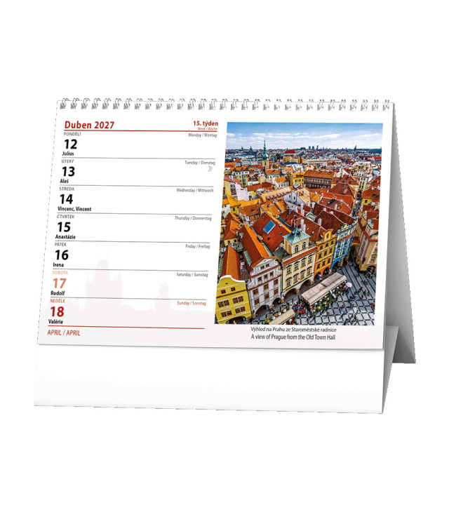 Stolní kalendář Praha 2027, Kalendárium: měsíční fáze, roční období, letní a zimní čas, dny a měsíce ve jazycích - CS, EN, DE, mezinárodní svátky CZ, SK, D, H, GB, E, I, F, A, UA, PL; Informační stránky: státní svátky, ostatní svátky a významné dny, tabulkový kalendář aktuálního a následujícího roku, místo na poznámky; Popis: Stolní kalendář s týdenním kalendáriem s obrázky pražských zákoutí. s kalendáriem České týdenní jmenné s jazykovou mutací CS, EN, DE/CZ weekly + CS, EN, DE/CZ wöchentlich + CS, EN, DE