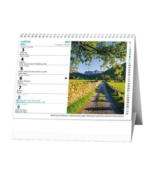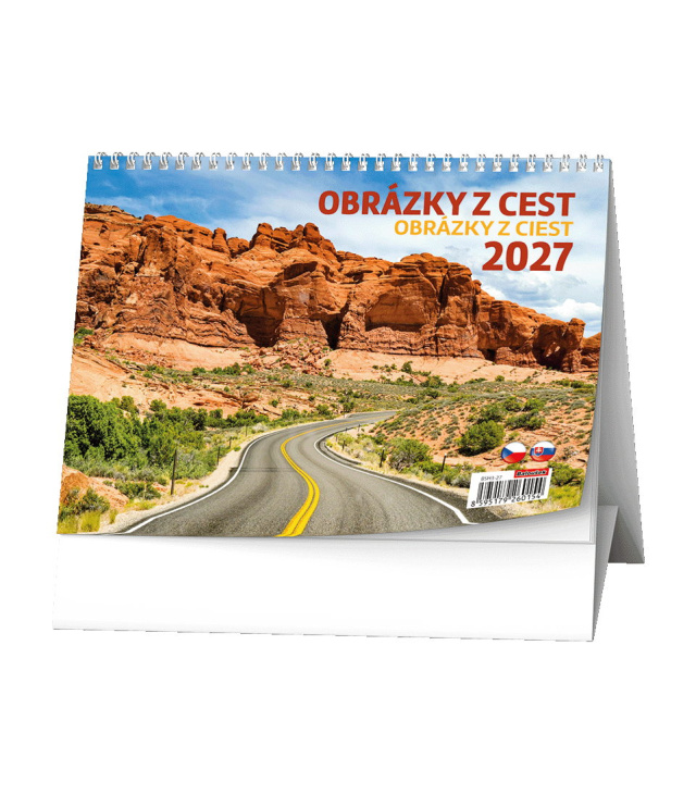 Stolní kalendář Obrázky z cest 2027, Kalendárium: měsíční fáze, roční období, letní a zimní čas, sloupcový měsíční přehled; Informační stránky: státní svátky, ostatní svátky a významné dny CZ/SK, tabulkový kalendář aktuálního a následujícího roku, místo pro poznámky; Popis: Stolní kalendář s týdenním kalendáriem s obrázky různých známých míst na světě. s kalendáriem České + slovenské týdenní jmenné /CZ+ SK weekly/CZ+SK wöchentlich