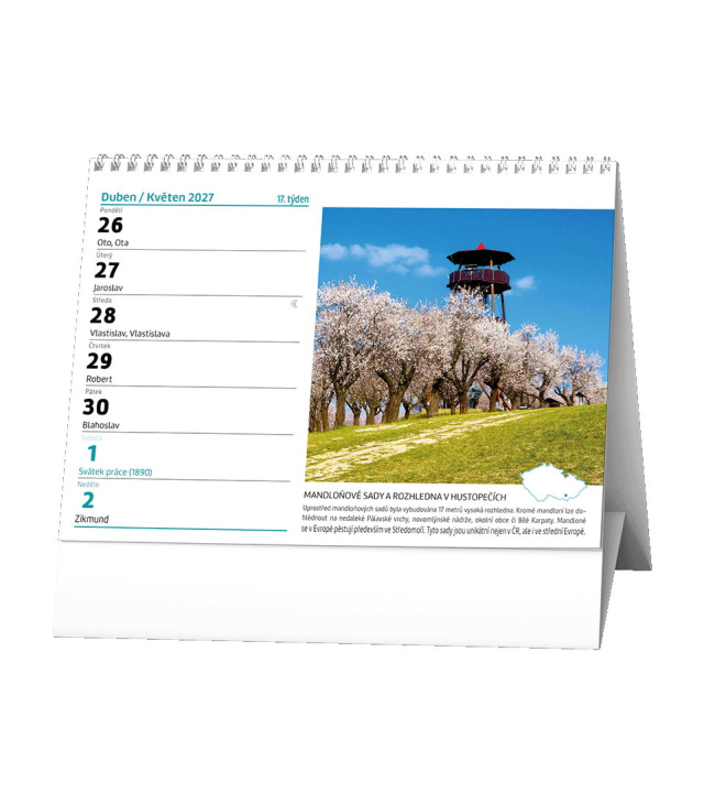 Stolní kalendář Poznáváme Českou republiku 2027, Kalendárium: měsíční fáze, roční období, letní a zimní čas, informace o zajímavých místech v ČR, a kde se nachází na mapě; Informační stránky: státní svátky, ostatní svátky a významné dny, tabulkový kalendář aktuálního a následujícího roku, místo na poznámky; Popis: Stolní kalendář s týdenním kalendáriem s obrázky známých míst v naší zemi. s kalendáriem České týdenní jmenné /CZ weekly/CZ wöchentlich