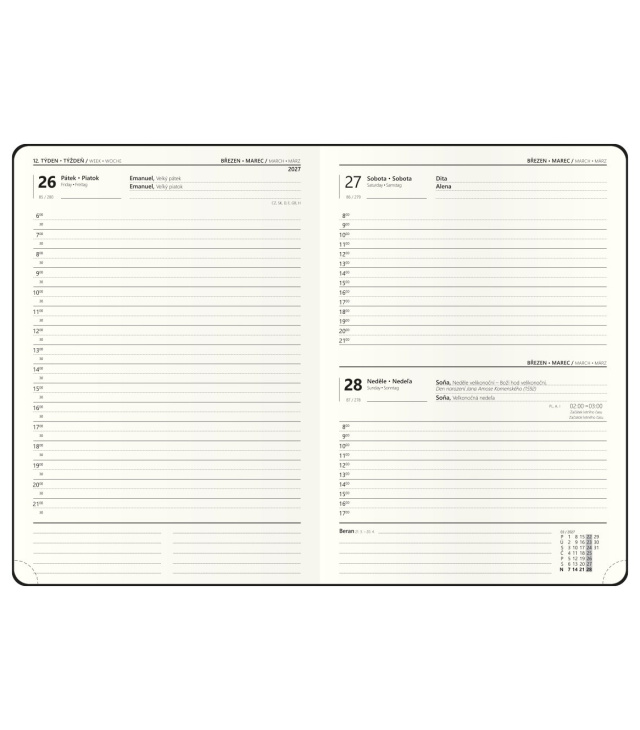Diář denní A5 - David - Hemingway - bordó 2027, Kalendárium: časové rozmezí 6:00 - 21:30, měsíční fáze, roční období, letní a zimní čas, znamení zvěrokruhu, odpočet dnů, měsíční tabulkový přehled, dny a měsíce v jazycích - CS, SK, EN, DE, mezinárodní svátky: CZ, SK, A, D, PL, H, GB, E, F, I, UA, místo na poznámky; Informační stránky: osobní údaje, přehledný kalendář aktuálního roku a následujícího roku, měsíční plánování aktuálního roku, plán dovolených aktuálního roku, přehled státních svátků a významných dnů CZ/SK, jmenný seznam CZ/SK, daňový kalendář CZ/SK aktuálního roku, mezinárodní svátky, důležitá telefonní čísla, roční plánovací kalendář CZ/SK aktuálního roku, místo pro poznámky, mapa CZ/SK, zadní předsádka - kapsa; Popis: Stylový denní diář barvy bordó, který díky měkké vazbě složíte do tašky nebo kapsy. Praktický, nadčasový s velkým prostorem pro poznámky a plánování. s kalendáriem CZ, SK, EN, DE; české a slovenské denní jmenné /CZ + SK daily/CZ + SK täglich