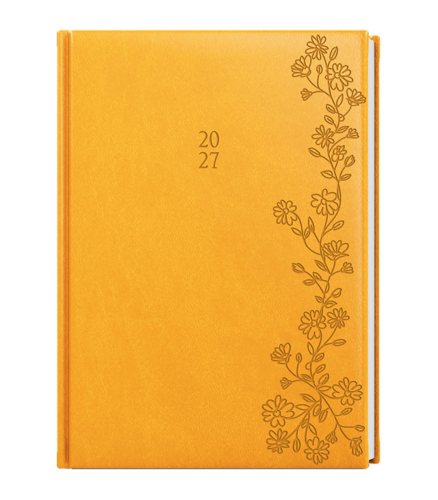 Diář denní A5 - David - Vivella s ražbou - okrová - Květy 2027, Kalendárium: časové rozmezí 6:00 - 21:30, měsíční fáze, roční období, letní a zimní čas, znamení zvěrokruhu, odpočet dnů, měsíční tabulkový přehled, dny a měsíce v jazycích - CS, SK, EN, DE, mezinárodní svátky: CZ, SK, A, D, PL, H, GB, E, F, I, UA, místo na poznámky; Informační stránky: osobní údaje, přehledný kalendář aktuálního roku a následujícího roku, měsíční plánování aktuálního roku, plán dovolených aktuálního roku, přehled státních svátků a významných dnů CZ/SK, jmenný seznam CZ/SK, daňový kalendář CZ/SK aktuálního roku, mezinárodní svátky, důležitá telefonní čísla, roční plánovací kalendář CZ/SK aktuálního roku, místo pro poznámky, mapa CZ/SK, zadní předsádka - kapsa; Popis: Denní diář A5 vyrobený z měkkého hladkého materiálu v okrové barvě s motivem Květin. Díky formátu a velkému prostoru si můžete efektivně plánovat každý den. s kalendáriem CZ, SK, EN, DE; české a slovenské denní jmenné /CZ + SK daily/CZ + SK täglich