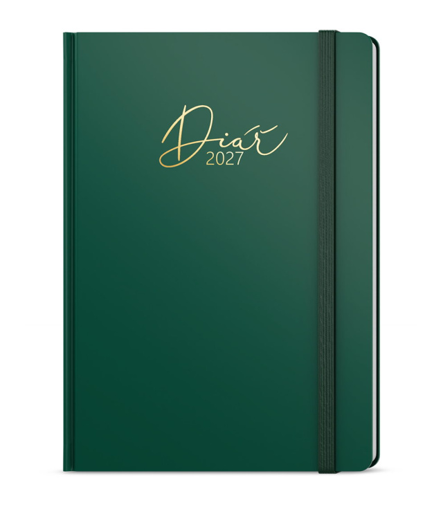 Diář denní A5 - David - Luxi - zelená 2027, Kalendárium: časové rozmezí 6:00 - 21:30, měsíční fáze, roční období, letní a zimní čas, znamení zvěrokruhu, odpočet dnů, měsíční tabulkový přehled, dny a měsíce v jazycích - CS, SK, EN, DE, mezinárodní svátky: CZ, SK, A, D, PL, H, GB, E, F, I, UA, místo na poznámky; Informační stránky: osobní údaje, přehledný kalendář aktuálního roku a následujícího roku, měsíční plánování aktuálního roku, plán dovolených aktuálního roku, přehled státních svátků a významných dnů CZ/SK, jmenný seznam CZ/SK, daňový kalendář CZ/SK aktuálního roku, mezinárodní svátky, důležitá telefonní čísla, roční plánovací kalendář CZ/SK aktuálního roku, místo pro poznámky, mapa CZ/SK, zadní předsádka - kapsa; Popis: Denní diář A5 má krásnou populární barvu a efektní zlatou ražbu roku. Každý den na jedné straně Vám dá prostor mnoha poznámek a časového plánování. s kalendáriem CZ, SK, EN, DE; české a slovenské denní jmenné /CZ + SK daily/CZ + SK täglich