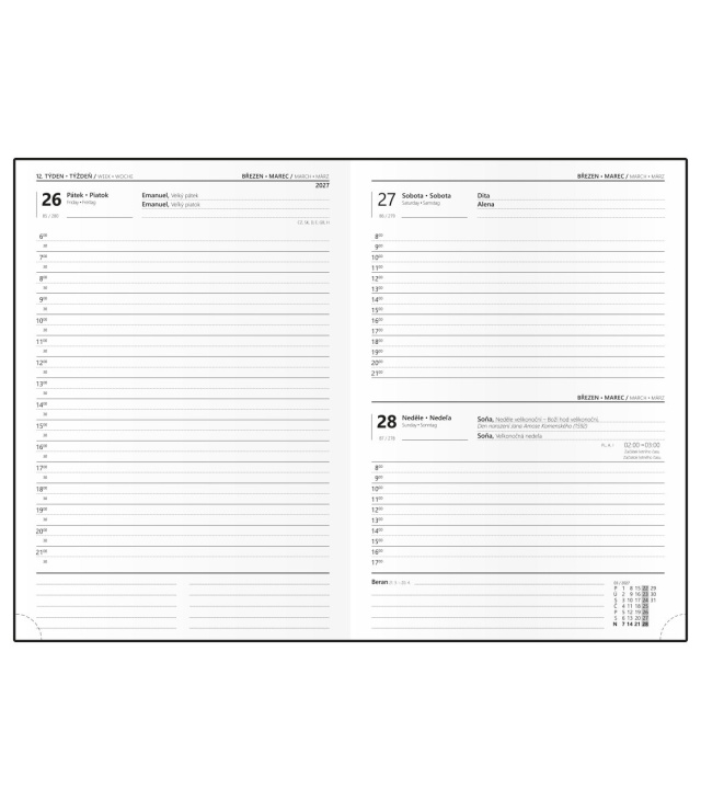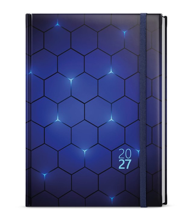 Diář denní A5 - David - Lamino - Síť - modrá 2027, Kalendárium: časové rozmezí 6:00 - 21:30, měsíční fáze, roční období, letní a zimní čas, znamení zvěrokruhu, odpočet dnů, měsíční tabulkový přehled, dny a měsíce v jazycích - CS, SK, EN, DE, mezinárodní svátky: CZ, SK, A, D, PL, H, GB, E, F, I, UA, místo na poznámky; Informační stránky: osobní údaje, přehledný kalendář aktuálního roku a následujícího roku, měsíční plánování aktuálního roku, plán dovolených aktuálního roku, přehled státních svátků a významných dnů CZ/SK, jmenný seznam CZ/SK, daňový kalendář CZ/SK aktuálního roku, mezinárodní svátky, důležitá telefonní čísla, roční plánovací kalendář CZ/SK aktuálního roku, místo pro poznámky, mapa CZ/SK, zadní předsádka - kapsa; Popis: Denní diář formátu A5 je vyráběný z matného hladkého lamina s parciálním lakem, který dodává každému diáři šmrnc. Jedná se nejen o skvělý doplněk, ale také si budete moci efektivněji plánovat Váš čas. s kalendáriem CZ, SK, EN, DE; české a slovenské denní jmenné /CZ + SK daily/CZ + SK täglich