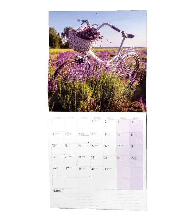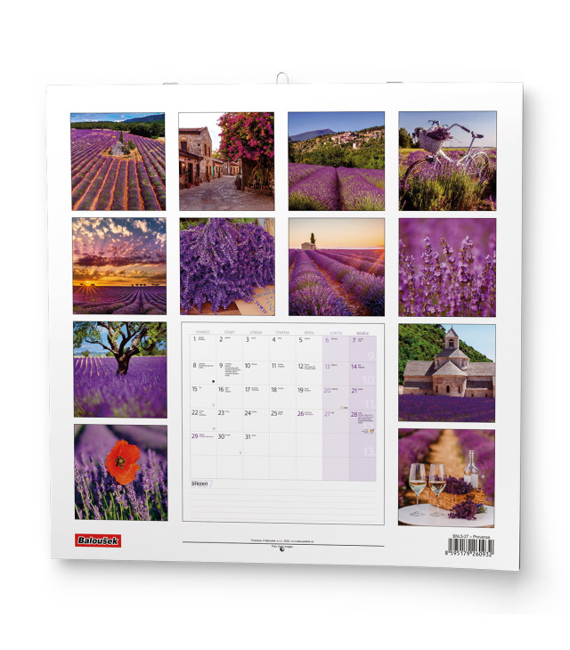 Nástěnný kalendář poznámkový Provence 2027, Kalendárium: poznámkové kalendárium se státními svátky, měsíční fáze, roční období, letní a zimní čas, místo na poznámky; Informační stránky: tabulkový kalendář aktuálního roku a následujícího roku, místo na poznámky; Popis: Nástěnný kalendář s měsíčním kalendáriem, v moderním formátu LP desky ve stylu Provence. s kalendáriem České měsíční jmenné / monthly CZ with CZ names / monatlich CZ mit dem CZ Namen