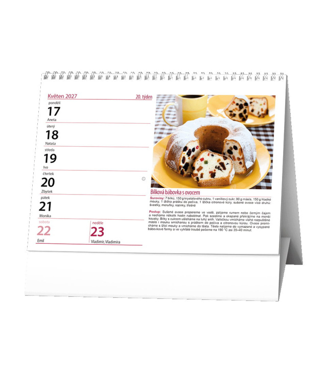 Stolní kalendář Sladké mňamky 2027, Kalendárium: měsíční fáze, roční období, letní a zimní čas, recepty; Informační stránky: státní svátky, ostatní svátky a významné dny, tabulkový kalendář aktuálního a následujícího roku, místo pro poznámky, seznam receptů; Popis: Stolní kalendář s týdenním kalendáriem a s recepty pro oblíbená sladká jídla. s kalendáriem České týdenní jmenné /CZ weekly/CZ wöchentlich