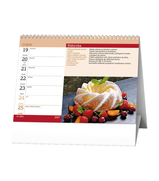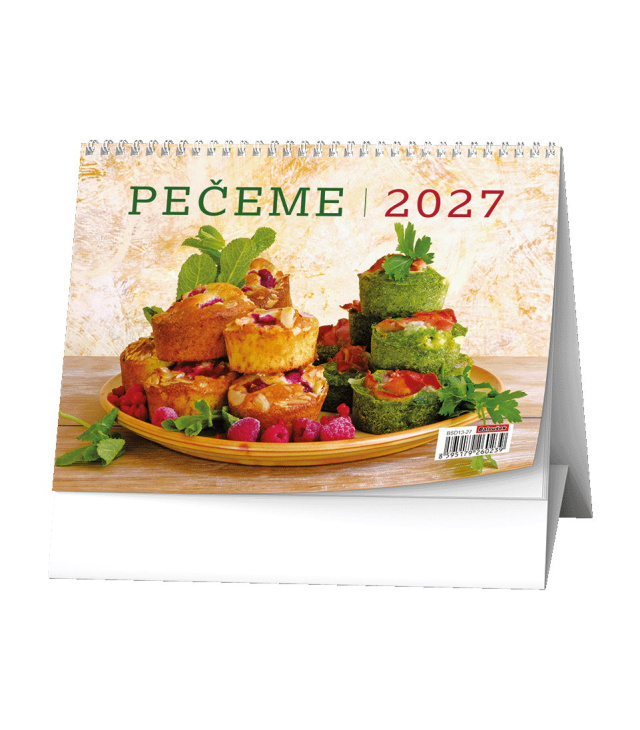 Stolní kalendář Pečeme! 2027, Kalendárium: měsíční fáze, roční období, letní a zimní čas, recepty; Informační stránky: státní svátky, ostatní svátky a významné dny, seznam receptů, tabulkový kalendář aktuálního a následujícího roku, místo na poznámky; Popis: Stolní kalendář s týdenním kalendáriem pro všechny milovníky sladkého i slaného pečení. s kalendáriem České týdenní jmenné /CZ weekly/CZ wöchentlich
