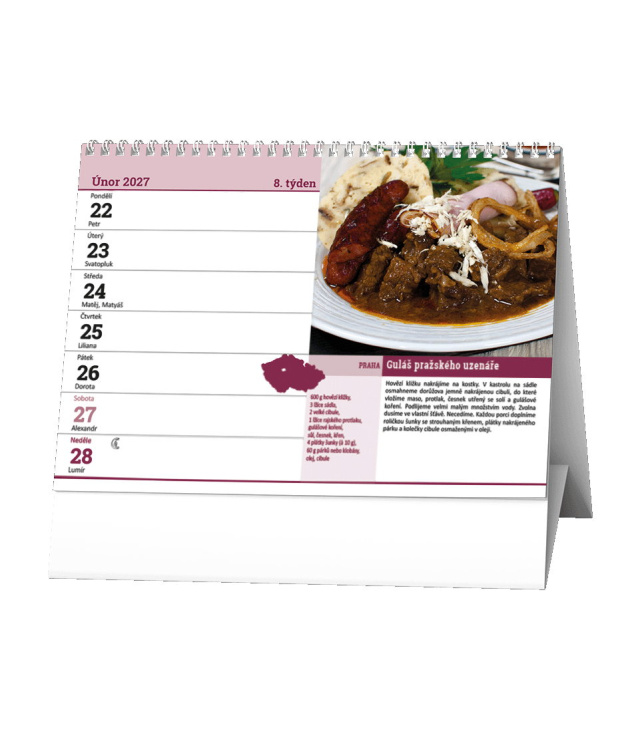 Stolní kalendář Regionální kuchyně 2027, Kalendárium: měsíční fáze, roční období, letní a zimní čas, recepty; Informační stránky: státní svátky, ostatní svátky a významné dny, seznam receptů, tabulkový kalendář aktuálního a následujícího roku, místo na poznámky; Popis: Stolní kalendář s týdenním kalendáriem pro milovníky vaření. s kalendáriem České týdenní jmenné /CZ weekly/CZ wöchentlich
