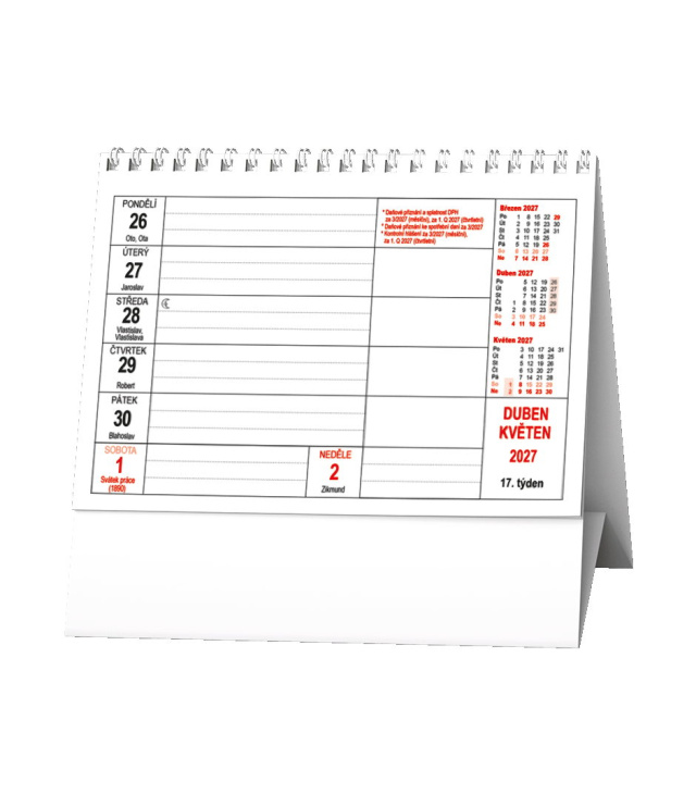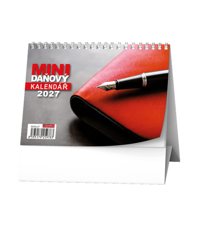 Stolní kalendář Mini daňový kalendář 2027, Kalendárium: měsíční fáze, roční období, letní a zimní čas, daňové termíny CZ, tabulkový přehled 3 měsíců, místo na poznámky; Informační stránky: plánovací kalendář aktuálního roku, přehled daňových povinností, státní svátky, významné dny, ostatní svátky; Popis: Tradice v novém designu. Mini praktický formát s týdenním kalendáriem pro plánování Vašich daní. s kalendáriem České týdenní jmenné /CZ weekly/CZ wöchentlich