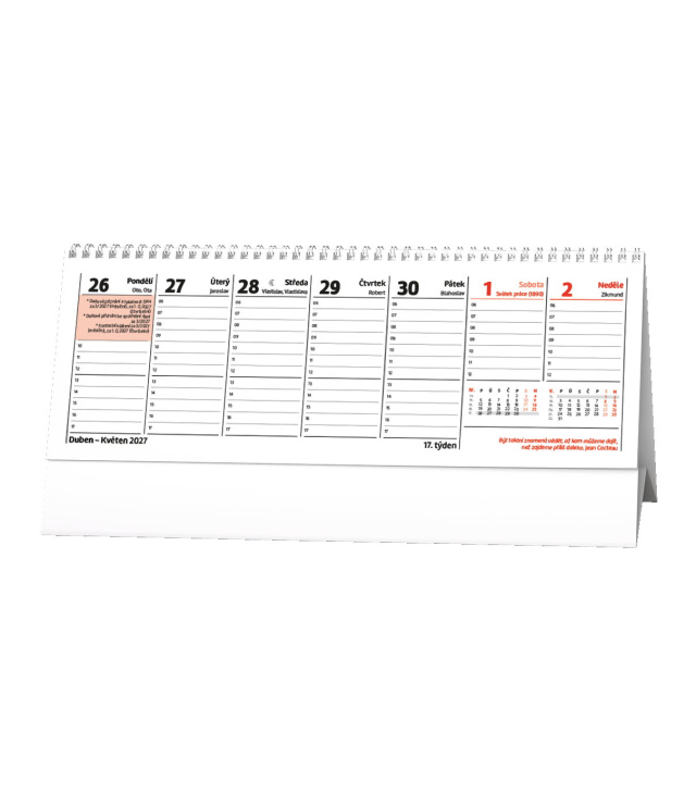 Stolní kalendář Pracovní kalendář CITÁTY II 2027, Kalendárium: měsíční fáze, roční období, letní a zimní čas, tabulkový přehled 3 měsíců, citát na každý týden, daňové termíny CZ, časové plánování; Informační stránky: tabulkový kalendář aktuálního a následujícího roku, plánovací kalendář aktuálního roku, státní svátky, ostatní svátky a významné dny, kalendář daňových povinností a poznámky; Popis: Pracovní kalendář s citáty na každý týden. V praktickém formátu a s týdenním kalendáriem bude Vašim pomocníkem. s kalendáriem České týdenní jmenné /CZ weekly/CZ wöchentlich