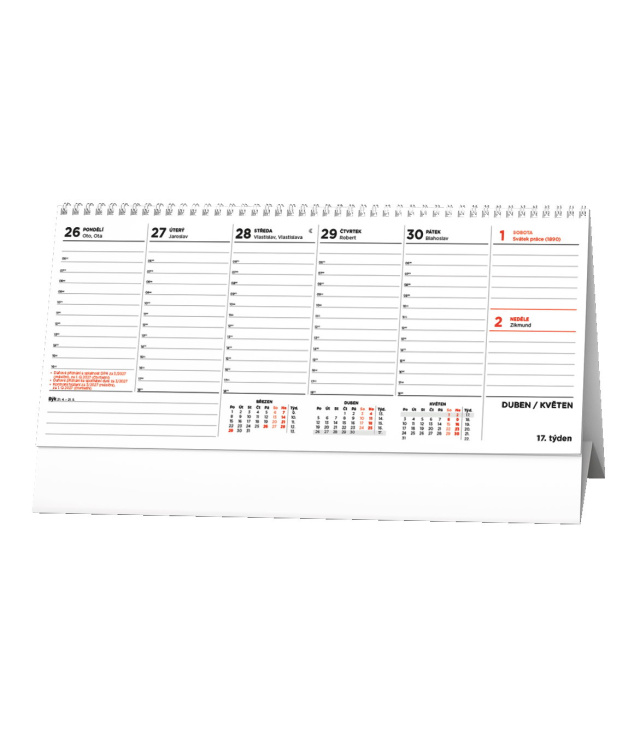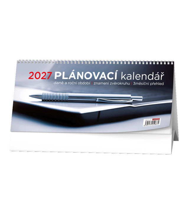 Stolní kalendář Plánovací daňový kalendář 2027, Kalendárium: daňové termíny CZ, znamení zvěrokruhu, měsíční fáze, tabulkový přehled 3měsíců, místo na poznámky, hodiny od 6-18h; Informační stránky: plánovací kalendář aktuálního roku, místo na poznámky, přehled 6 měsíců se jmény leden až červen aktuálního roku, znamení zvěrokruhu, poznámky, přehled 6 měsíců se jmény červenec až prosinec aktuálního roku, tabulkový kalendář aktuálního roku, abecední seznam jmen; Popis: Stolní plánovací kalendář s časy a velkým prostorem na poznámky je skvělý doplněk pro Vaše plánování práce či volného času. s kalendáriem České týdenní jmenné /CZ weekly/CZ wöchentlich