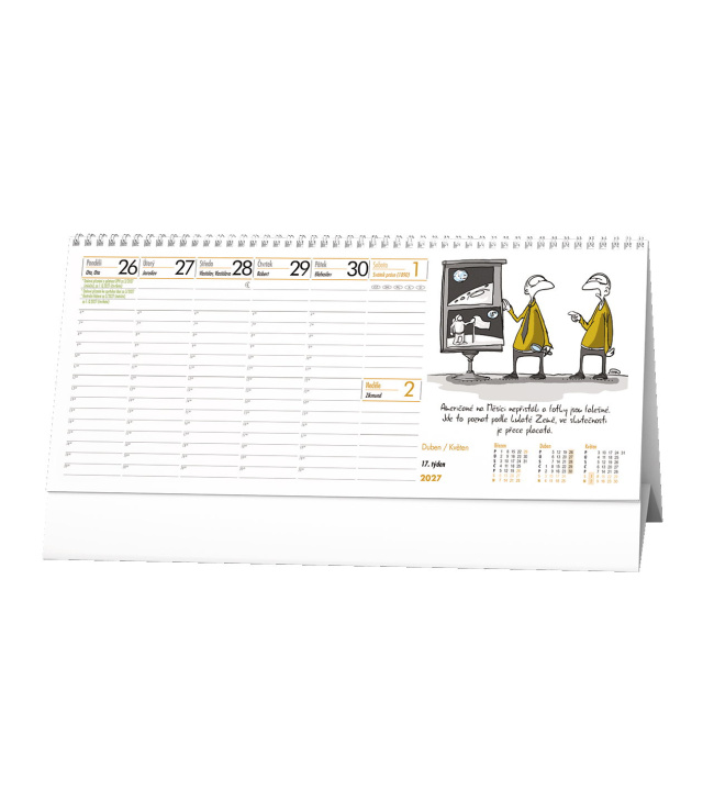 Stolní kalendář Pracovní daňový kalendář - Svět podle Marka Simona 2027, Kalendárium: měsíční fáze, roční období, letní a zimní čas, mezinárodní svátky CZ, SK, PL, A, D, daňové termíny CZ, tabulkový přehled 3 měsíců, kreslený vtip na každý týden, časové plánování; Informační stránky: státní svátky, ostatní svátky a významné dny, tabulkový kalendář aktuálního a nadcházejícího roku, plánovací kalendář aktuálního roku, přehled daňových povinností, místo na poznámky; Popis: Daňový týdenní kalendář s ilustrovanými vtipy od Marka Simona, které oživí Váš den. s kalendáriem České týdenní jmenné /CZ weekly/CZ wöchentlich