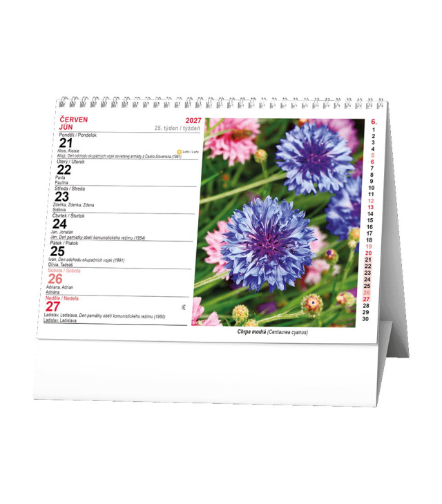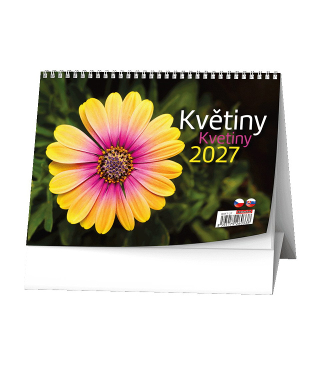 Stolní kalendář Květiny 2027, Kalendárium: měsíční fáze, roční období, letní a zimní čas, sloupcový měsíční přehled; Informační stránky: státní svátky, ostatní svátky a významné dny CZ/SK, místo na poznámky; Popis: Stolní kalendář s týdenním kalendáriem s obrázky květin. s kalendáriem České + slovenské týdenní jmenné /CZ+ SK weekly/CZ+SK wöchentlich