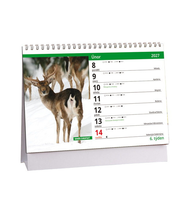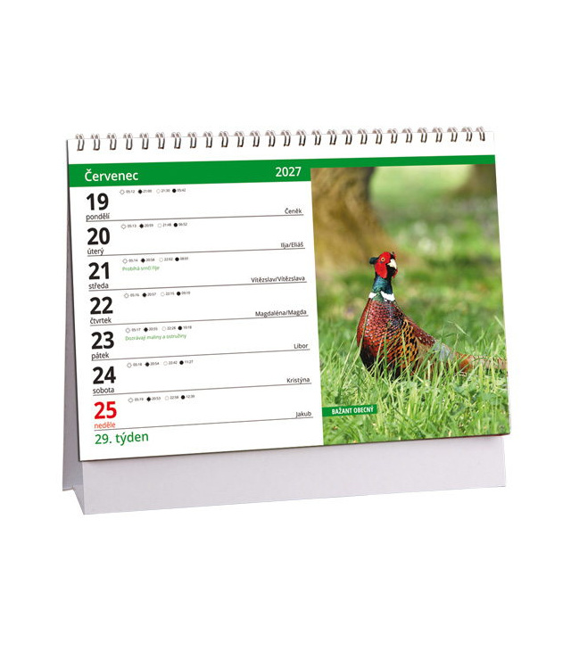 Stolní kalendář Myslivecký 2027, Kalendář obsahuje: východy a západy Slunce a Měsíce,fáze měsíce, doby lovu zvěře, seznam jmen, plánovací kalendář 2027, tabulkové kalendáře 2027 a 2028., české týdenní řádkové / CZ weekly / CZ wöchentlich