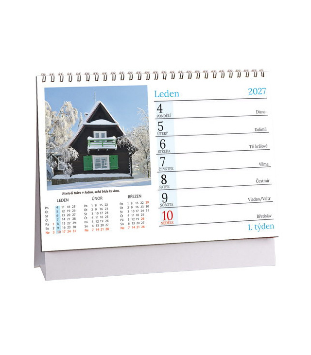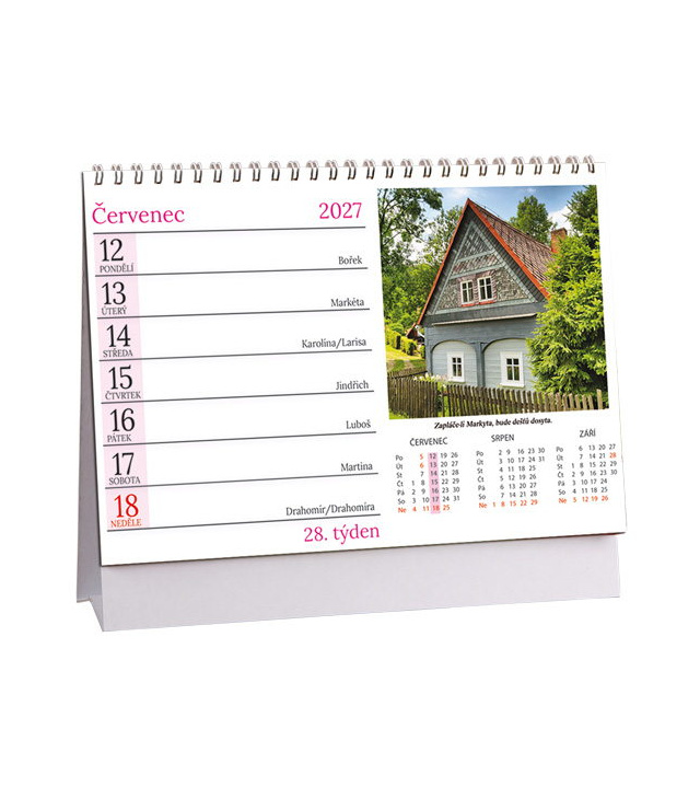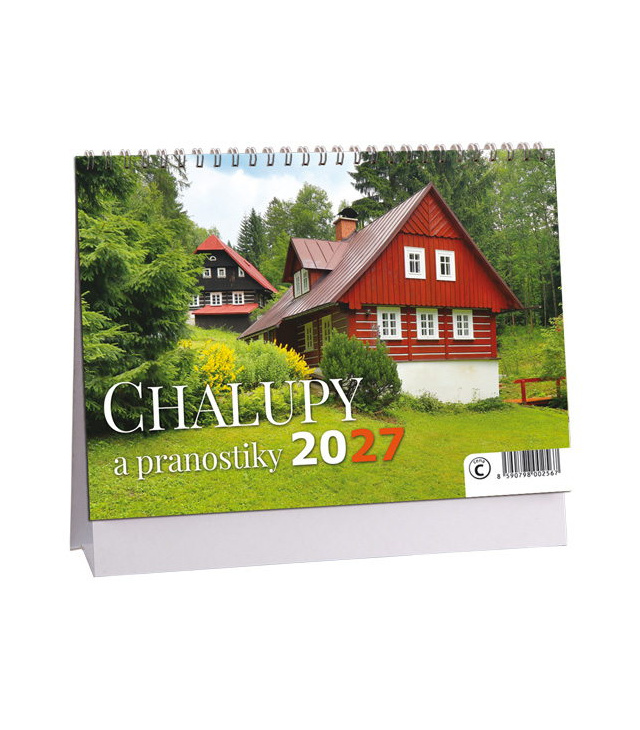 Stolní kalendář Chalupy a pranostiky 2027, Kalendář obsahuje: fáze měsíce; seznam jmen, plánovací kalendář 2027, poznámky, tabulkové kalendáře 2027 a 2028, 3měsíční přehled., české týdenní řádkové / CZ weekly / CZ wöchentlich