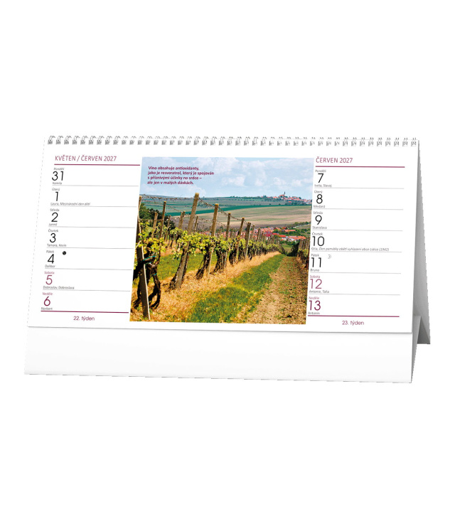 Stolní kalendář Víno - 14denní 2027, Kalendárium: měsíční fáze, roční období, letní a zimní čas, informace o vínu a vinařstvích; Informační stránky: státní svátky, ostatní svátky a významné dny, tabulkový kalendář aktuálního a následujícího roku, místo na poznámky; Popis: Vinaři pozor! Stolní kalendář se čtrnáctidenním kalendáriem pro všechny milovníky vína. s kalendáriem České čtrnáctidenní jmenné / CZ biweekly / CZ zweiwochentlich
