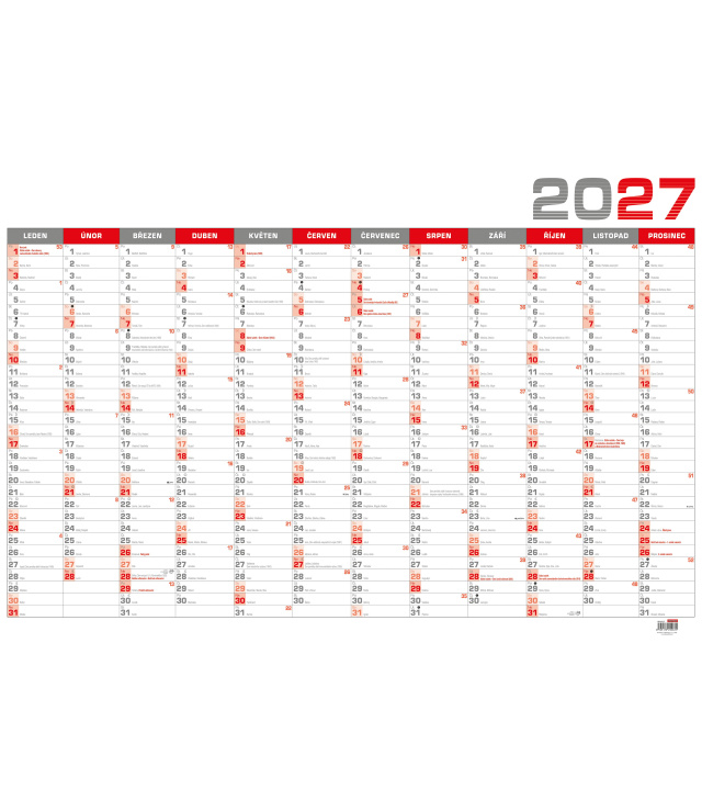 Nástěnný kalendář roční B1 (96,4 x 67 cm) - červený 2027, Kalendárium: měsíční fáze, roční období, letní a zimní čas; Popis: Velký nástěnný kalendář vhodný pro kanceláře na zapisování všech důležitých termínů, laděný do červené barvy. s kalendáriem České roční jmenné / yearly CZ with CZ names / järlich CZ mit dem CZ Name
