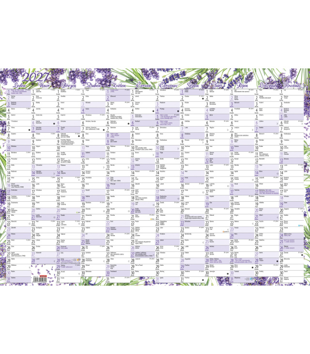 Nástěnný kalendář roční (60 x 42 cm) - Levandule 2027, Kalendárium: měsíční fáze, roční období, letní a zimní čas; Popis: Nástěnný roční kalendář s motivem Levandule v praktické velikosti 60 cm. Pověste si ho na lednici nebo na skříň a prostě plánujte. s kalendáriem České roční jmenné / yearly CZ with CZ names / järlich CZ mit dem CZ Name