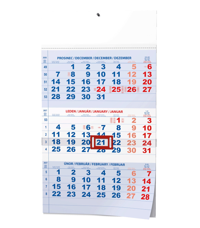 Nástěnný kalendář Tříměsíční - A3 (s mezinárodními svátky) - modrý 2027, Kalendárium: dny a měsíce v jazycích - CS, SK, EN, DE, mezinárodní svátky: CZ, SK, A, D, PL, H, GB, E, F, I, UA; Popis: Praktický nástěnný kalendář s tříměsíčním kalendáriem a posuvným jezdcem vhodný do Vaší kanceláře. s kalendáriem České tříměsíční s jazyky CZ,SK, EN, DE / CZ 3monthly / CZ 3monatlich