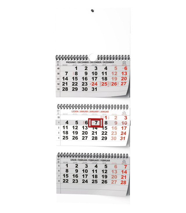 Nástěnný kalendář Tříměsíční - skládaný (s mezinárodními svátky) 2027, Kalendárium: dny a měsíce v jazycích - CS, SK, EN, DE, mezinárodní svátky: CZ, SK, A, D, PL, H, GB, E, F, I, UA; Popis: Praktický skládací nástěnný kalendář s tříměsíčním kalendáriem a posuvným jezdcem vhodný do Vaší kanceláře. s kalendáriem České tříměsíční s jazyky CZ,SK, EN, DE / CZ 3monthly / CZ 3monatlich