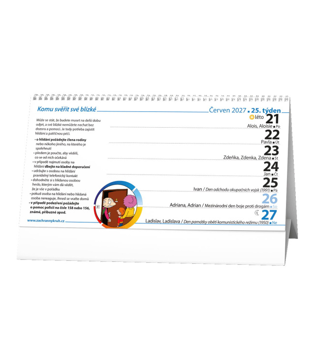 Stolní kalendář Kalendář pro naše babičky a dědečky 2027, Kalendárium: měsíční fáze, roční období, letní a zimní čas, rady pro seniory; Informační stránky: úvodník Asociace Záchranný kruh, tabulkový kalendář aktuálního a následujícího roku, vysvětlivky fází měsíce, místo na poznámky; Popis: Stolní kalendář s týdenním kalendáriem, s tipy a radami nejen pro seniory. s kalendáriem České týdenní jmenné /CZ weekly/CZ wöchentlich