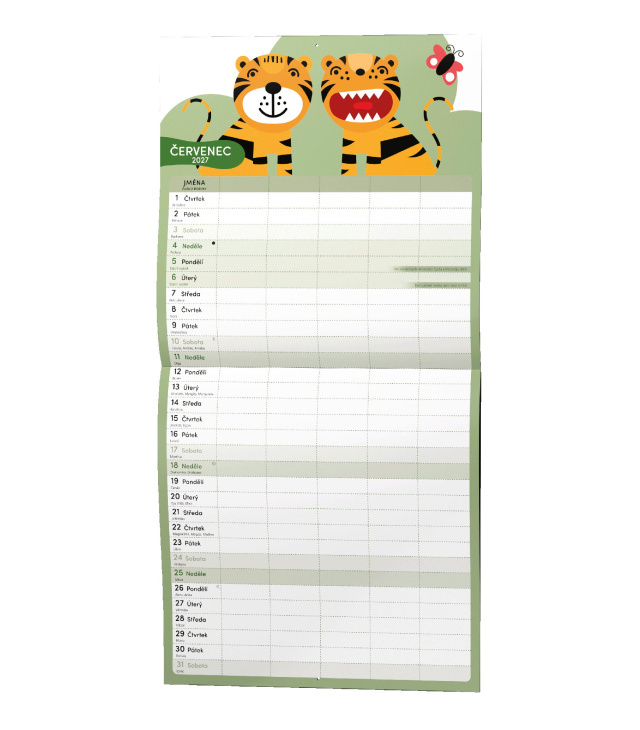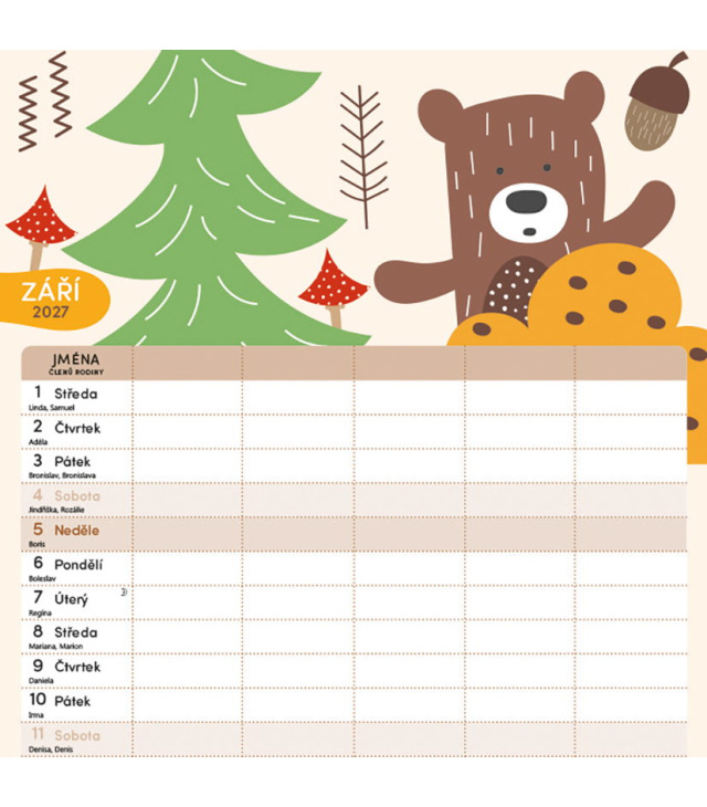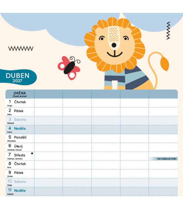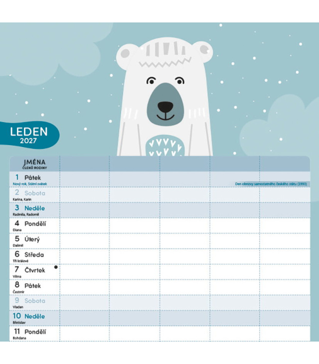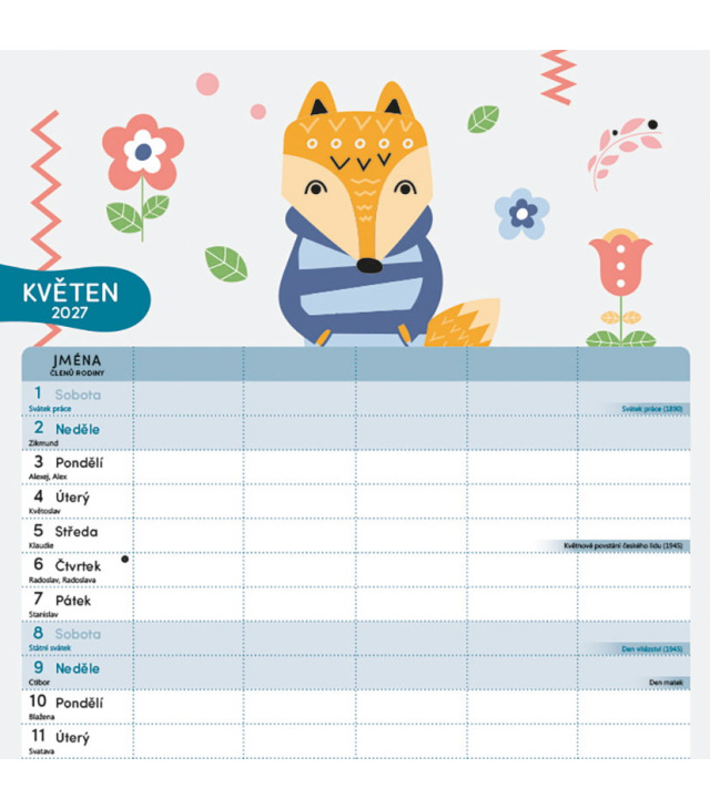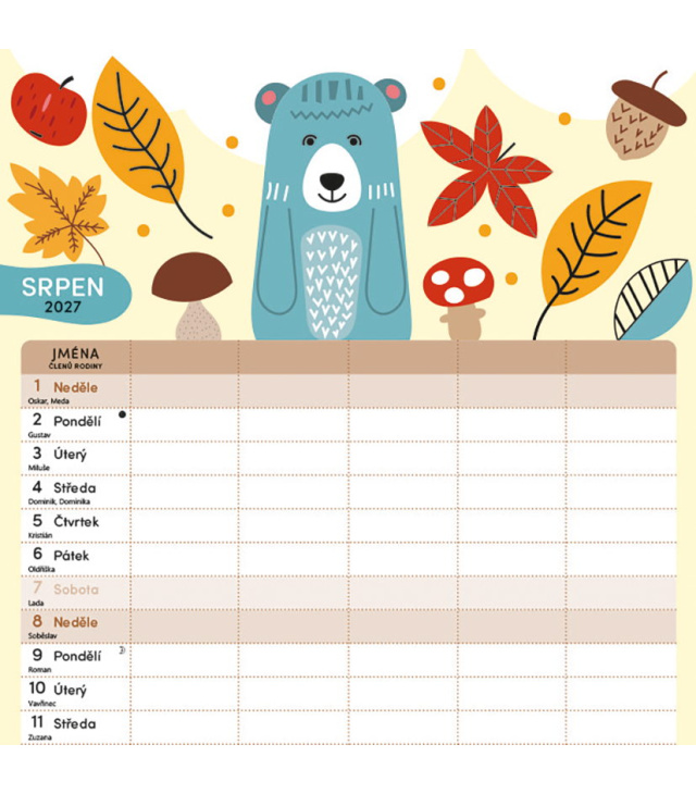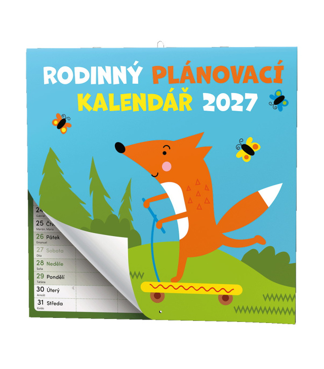 Nástěnný kalendář poznámkový Rodinný plánovací kalendář 2027, Kalendárium: poznámkové kalendárium se státními svátky, měsíční fáze, roční období, letní a zimní čas, místo na poznámky pro členy rodiny; Informační stránky: tabulkový kalendář aktuálního a následujícího roku, místo na poznámky, rozvrh hodin; Popis: Přehledný nástěnný kalendář pro to správné rodinné plánování. s kalendáriem České měsíční jmenné / monthly CZ with CZ names / monatlich CZ mit dem CZ Namen