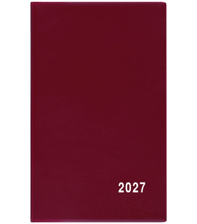 Diář kapesní čtrnáctidenní - Alois - PVC - bordó 2027, Kalendárium: měsíční fáze, roční období, letní a zimní čas, tabulkový přehled 2 měsíců; Informační stránky: osobní záznamy, důležitá telefonní čísla, čtvrtletní plánovací kalendář aktuálního roku, tabulkový kalendář následujícího roku, jmenný seznam, místo na poznámky, roční plánovací kalendář aktuálního roku; Popis: Jednoduchý a praktický týdenní diář vyrobený z jemného hladkého materiálu s polomatným povrchem v barvě bordó. Ideální pro každého, kdo si oblíbil měkkou šitou vazbu. s kalendáriem České čtrnáctidenní jmenné / CZ biweekly / CZ zweiwochentlich