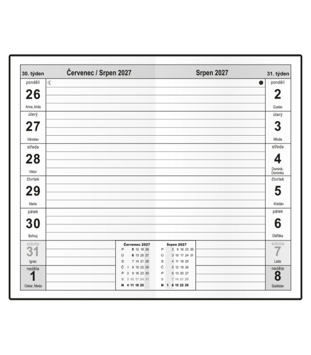 Diář kapesní čtrnáctidenní - Alois - COLOR - PVC - Růžová 2027, Kalendárium: měsíční fáze, roční období, letní a zimní čas, tabulkový přehled 2 měsíců; Informační stránky: osobní záznamy, důležitá telefonní čísla, čtvrtletní plánovací kalendář aktuálního roku, tabulkový kalendář následujícího roku, jmenný seznam, místo na poznámky, roční plánovací kalendář aktuálního roku; Popis: Jednoduchý a praktický týdenní diář z hladkého matného materiálu. Ideální pro každého, kdo si oblíbil měkkou šitou vazbu. s kalendáriem České čtrnáctidenní jmenné / CZ biweekly / CZ zweiwochentlich