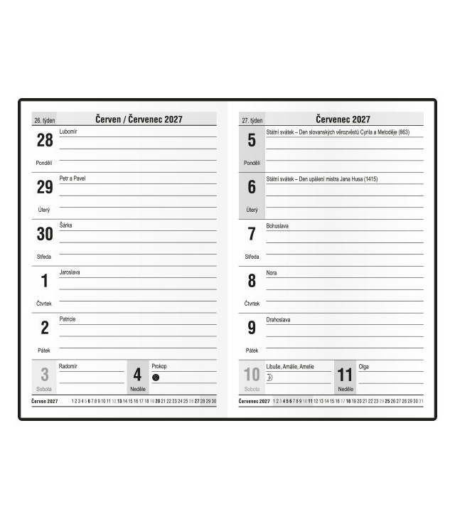 Diář kapesní čtrnáctidenní - Gustav - PVC - modrá 2027, Kalendárium: měsíční fáze, roční období, letní a zimní čas, řádkový přehled 2 měsíců; Informační stránky: osobní záznamy, čtvrtletní plánovací kalendář aktuálního roku, tabulkový kalendář následujícího roku, místo na poznámky; Popis: Jednoduchý a praktický týdenní diář vyrobený z jemného hladkého materiálu s polomatným povrchem modré barvy. Ideální pro každého, kdo si oblíbil měkkou šitou vazbu. s kalendáriem České čtrnáctidenní jmenné / CZ biweekly / CZ zweiwochentlich