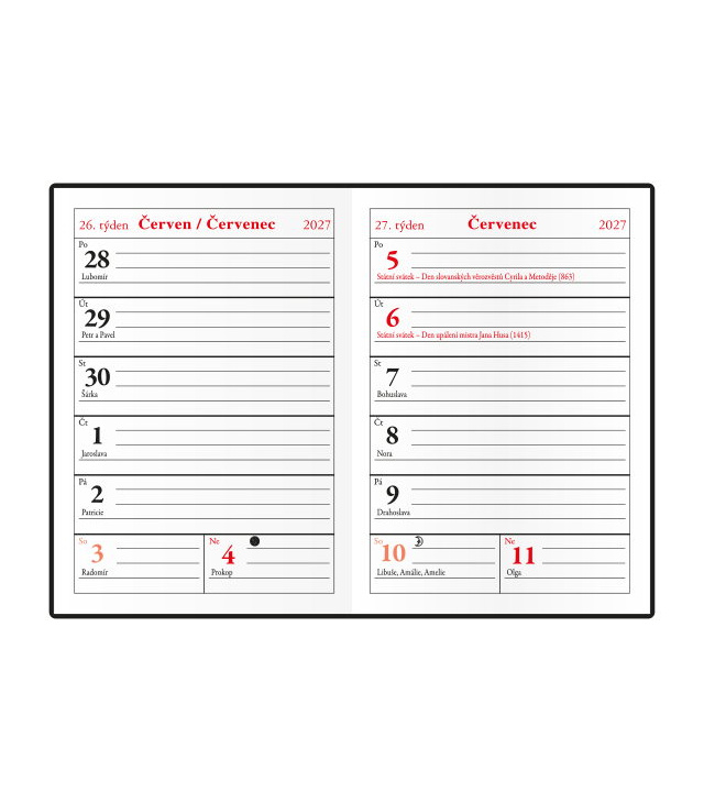 Diář kapesní čtrnáctidenní - Ladislav - PVC - modrá 2027, Kalendárium: měsíční fáze, roční období, letní a zimní čas ; Informační stránky: osobní záznamy, čtvrtletní plánovací kalendář aktuálního roku, tabulkový kalendář následujícího roku, místo na poznámky; Popis: Jednoduchý a praktický týdenní diář vyrobený z jemného hladkého materiálu s polomatným povrchem modré barvy. Ideální pro každého, kdo si oblíbil měkkou šitou vazbu. s kalendáriem České čtrnáctidenní jmenné / CZ biweekly / CZ zweiwochentlich