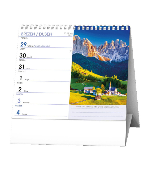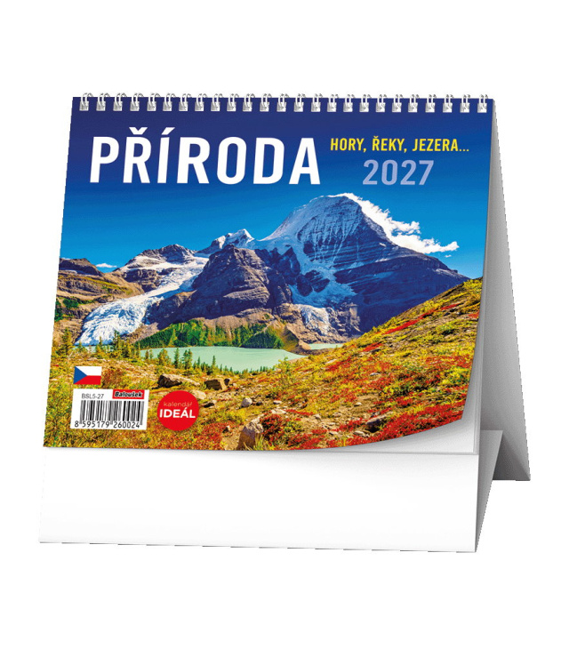 Stolní kalendář IDEÁL - Příroda, hory, řeky, jezera… 2027, Kalendárium: měsíční fáze, roční období, letní a zimní čas, prostor na poznámky; Informační stránky: státní svátky, ostatní svátky a významné dny, tabulkový kalendář aktuálního a nadcházejícího roku, místo na poznámky; Popis: Ideální kalendář za ideální cenu s týdenním kalendáriem a v praktickém formátu s obrázky řek, hor a jezer. s kalendáriem České týdenní jmenné /CZ weekly/CZ wöchentlich