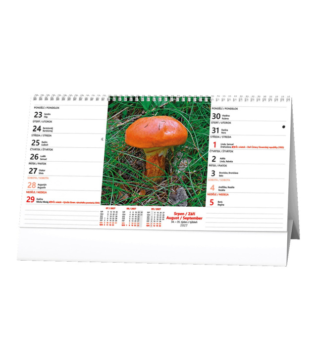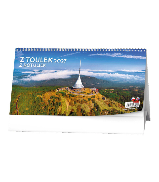 Stolní kalendář Z toulek - 14denní 2027, Kalendárium: měsíční fáze, roční období, letní a zimní čas, tabulkový přehled 3 měsíců, místo pro poznámky; Informační stránky: státní svátky a významné dny CZ/SK, tabulkový kalendář aktuálního a následujícího roku, místo na poznámky; Popis: Stolní kalendář se čtrnáctidenním kalendáriem s obrázky přírody pro milovníky toulek a krásných přírodních zákoutí. s kalendáriem České + slovenské čtrnáctidenní jmenné /CZ+ SK biweekly/CZ+SK zweiwochentlich