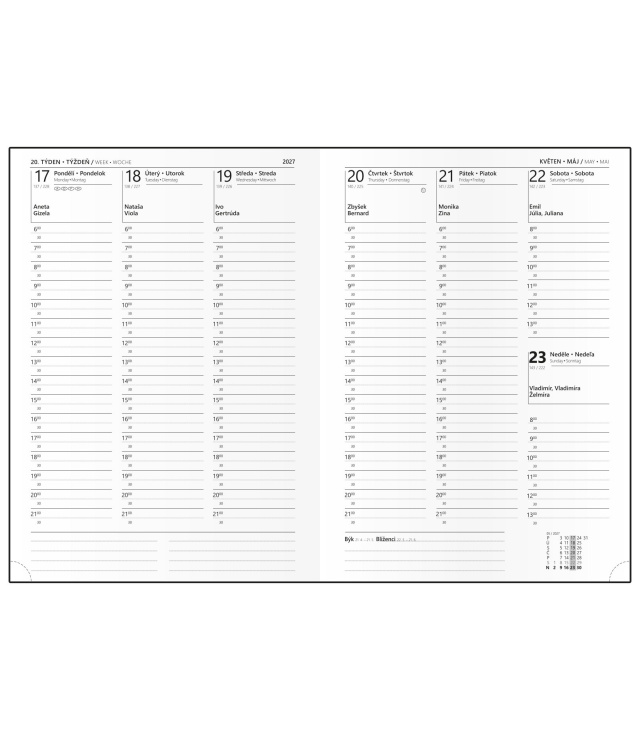 Diář týdenní A4 - Tomáš - Balacron - černá 2027, Kalendárium: časové rozmezí 6:00 - 21:30, měsíční fáze, roční období, letní a zimní čas, znamení zvěrokruhu, odpočet dnů, měsíční tabulkový přehled, dny a měsíce v jazycích - CS, SK, EN, DE, mezinárodní svátky: CZ, SK, A, D, PL, H, GB, E, F, I, UA, místo na poznámky; Informační stránky: přehledný kalendář aktuálního roku a následujícího roku, měsíční plánování aktuálního roku, plán dovolených aktuálního roku, přehled státních svátků a významných dnů CZ/SK, jmenný seznam CZ/SK, mezinárodní svátky, důležitá telefonní čísla, roční plánovací kalendář CZ/SK aktuálního roku, daňový kalendář CZ/SK aktuálního roku, místo pro poznámky; Popis: Týdenní diář ve formátu A4 v jednoduchém stylu a v hladkém provedení. Skvělý formát diáře Vám usnadní naplánovat jakékoli schůzky a úkoly na celý týden. s kalendáriem CZ, SK, EN, DE; české a slovenské týdenní jmenné /CZ + SK weekly/CZ + SK wöchentlich