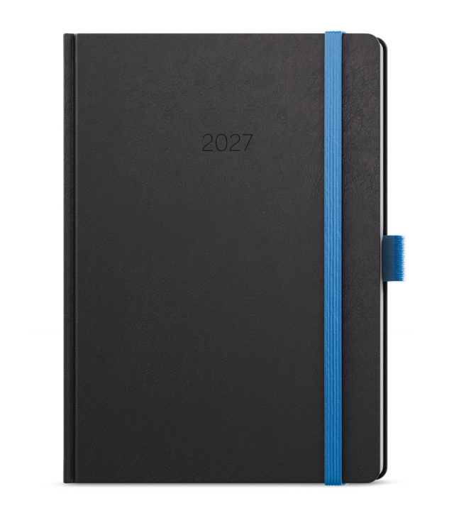 Diář týdenní A5 - Oskar - Nora - černá, modrá 2027, Kalendárium: časové rozmezí: 6:00 - 21:30, měsíční fáze, roční období, letní a zimní čas, znamení zvěrokruhu, odpočet dnů, měsíční tabulkový přehled, dny a měsíce v 4 jazycích - CS, SK, EN, DE, mezinárodní svátky: CZ, SK, A, D, PL, H, GB, E, F, I, UA, místo na poznámky; Informační stránky: osobní údaje, přehledný kalendář aktuálního roku a následujícího roku, měsíční plánování aktuálního roku, plán dovolených aktuálního roku, přehled státních svátků a významných dnů CZ/SK, jmenný seznam CZ/SK, daňový kalendář CZ/SK aktuálního roku, mezinárodní svátky, důležitá telefonní čísla, roční plánovací kalendář CZ/SK aktuálního roku, místo pro poznámky, mapa CZ/SK, zadní předsádka - kapsa; Popis: Neobyčejný týdenní diář s matným povrchem ze strukturovaného materiálu s modrou gumičkou a poutkem. Je vyráběný ve formátu A5, má velký prostor pro poznámky a plánování. s kalendáriem CZ, SK, EN, DE; české a slovenské týdenní jmenné /CZ + SK weekly/CZ + SK wöchentlich