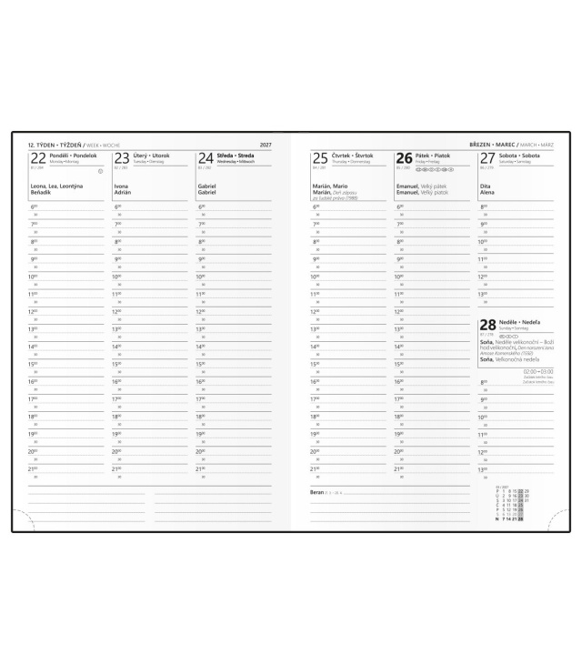 Diář týdenní A5 - Oskar - ForMen - Silver - stříbrná 2027, Kalendárium: časové rozmezí: 6:00 - 21:30, měsíční fáze, roční období, letní a zimní čas, znamení zvěrokruhu, odpočet dnů, měsíční tabulkový přehled, dny a měsíce v 4 jazycích - CS, SK, EN, DE, mezinárodní svátky: CZ, SK, A, D, PL, H, GB, E, F, I, UA, místo na poznámky; Informační stránky: osobní údaje, přehledný kalendář aktuálního roku a následujícího roku, měsíční plánování aktuálního roku, plán dovolených aktuálního roku, přehled státních svátků a významných dnů CZ/SK, jmenný seznam CZ/SK, daňový kalendář CZ/SK aktuálního roku, mezinárodní svátky, důležitá telefonní čísla, roční plánovací kalendář CZ/SK aktuálního roku, místo pro poznámky, mapa CZ/SK, zadní předsádka - kapsa; Popis: Týdenní diář nejen pro stylové muže ve stříbrném provedení s jedinečnou ražbou. Módní doplněk s prostorem pro poznámky a plánování. s kalendáriem CZ, SK, EN, DE; české a slovenské týdenní jmenné /CZ + SK weekly/CZ + SK wöchentlich