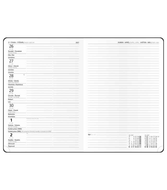 Diář týdenní A5 poznámkový - Zoro - Flexi - černá 2027, Kalendárium: měsíční fáze, roční období, letní a zimní čas, znamení zvěrokruhu, odpočet dnů, měsíční tabulkový kalendář, dny a měsíce v jazycích - CS, SK, EN, DE, mezinárodní svátky: CZ, SK, A, D, PL, H, GB, E, F, I, UA, velký prostor na poznámky; Informační stránky: osobní údaje, přehledný kalendář aktuálního roku a následujícího roku, měsíční plánování aktuálního roku, plán dovolených aktuálního roku, přehled státních svátků a významných dnů CZ/SK, jmenný seznam CZ/SK, daňový kalendář CZ/SK aktuálního roku, mezinárodní svátky, důležitá telefonní čísla, roční plánovací kalendář CZ/SK aktuálního roku, místo na poznámky, zadní předsádka - kapsa; Popis: Diář s týdenním kalendáriem na jedné straně a na druhé straně s prostorem na poznámky. Desky jsou ohebnější, mají moderní ražbu, kulaté rohy a gumičku. s kalendáriem CZ, SK, EN, DE; české a slovenské týdenní jmenné /CZ + SK weekly/CZ + SK wöchentlich
