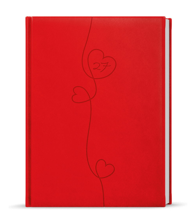 Diář týdenní B6 - Prokop - Vivella s ražbou - červená - Srdce 2027, Kalendárium: měsíční fáze, roční období, letní a zimní čas, znamení zvěrokruhu, odpočet dnů, měsíční tabulkový přehled, dny a měsíce v jazycích - CS, SK, EN, DE, mezinárodní svátky: CZ, SK, A, D, PL, H, GB, E, F, I, UA; Informační stránky: osobní údaje, přehledný kalendář aktuálního roku a následujícího roku, měsíční plánování aktuálního roku, plán dovolených aktuálního roku, přehled státních svátků a významných dnů CZ/SK, jmenný seznam CZ/SK, mezinárodní svátky, daňový kalendář CZ/SK aktuálního roku, roční plánovací kalendář CZ/SK aktuálního roku, místo pro poznámky, zadní předsádka - kapsa; Popis: Týdenní diář v červené vivelle s krásnou ražbou s motivem Srdce. Diář v oblíbeném formátu s velkým prostorem pro poznámky a plánování. s kalendáriem CZ, SK, EN, DE; české a slovenské týdenní jmenné /CZ + SK weekly/CZ + SK wöchentlich