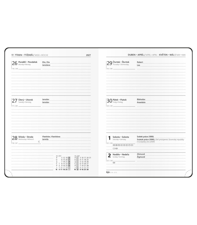 Diář týdenní B6 - Prokop - Luxi - bordó 2027, Kalendárium: měsíční fáze, roční období, letní a zimní čas, znamení zvěrokruhu, odpočet dnů, měsíční tabulkový přehled, dny a měsíce v jazycích - CS, SK, EN, DE, mezinárodní svátky: CZ, SK, A, D, PL, H, GB, E, F, I, UA; Informační stránky: osobní údaje, přehledný kalendář aktuálního roku a následujícího roku, měsíční plánování aktuálního roku, plán dovolených aktuálního roku, přehled státních svátků a významných dnů CZ/SK, jmenný seznam CZ/SK, mezinárodní svátky, daňový kalendář CZ/SK aktuálního roku, roční plánovací kalendář CZ/SK aktuálního roku, místo pro poznámky, zadní předsádka - kapsa; Popis: Týdenní diář v populárním rozměru B6 v krásných barevných kombinacích a efektní zlatou ražbou. s kalendáriem CZ, SK, EN, DE; české a slovenské týdenní jmenné /CZ + SK weekly/CZ + SK wöchentlich
