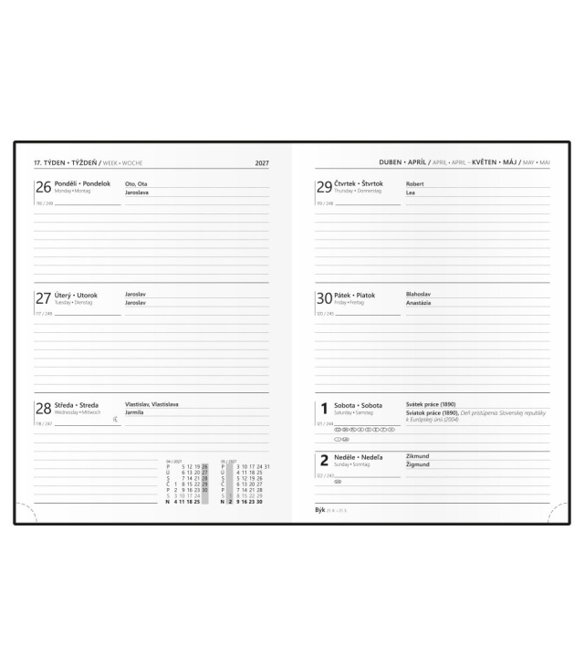 Diář týdenní B6 - Prokop - Lamino Pastel - fialová 2027, Kalendárium: měsíční fáze, roční období, letní a zimní čas, znamení zvěrokruhu, odpočet dnů, měsíční tabulkový přehled, dny a měsíce v jazycích - CS, SK, EN, DE, mezinárodní svátky: CZ, SK, A, D, PL, H, GB, E, F, I, UA; Informační stránky: osobní údaje, přehledný kalendář aktuálního roku a následujícího roku, měsíční plánování aktuálního roku, plán dovolených aktuálního roku, přehled státních svátků a významných dnů CZ/SK, jmenný seznam CZ/SK, mezinárodní svátky, daňový kalendář CZ/SK aktuálního roku, roční plánovací kalendář CZ/SK aktuálního roku, místo pro poznámky, zadní předsádka - kapsa; Popis: Trendy a praktický týdenní diář v pastelově fialovém odstínu, potažený nepoškrabatelném matným laminem s parciálním lakem. Diář má velký prostor pro poznámky a plánování. s kalendáriem CZ, SK, EN, DE; české a slovenské týdenní jmenné /CZ + SK weekly/CZ + SK wöchentlich