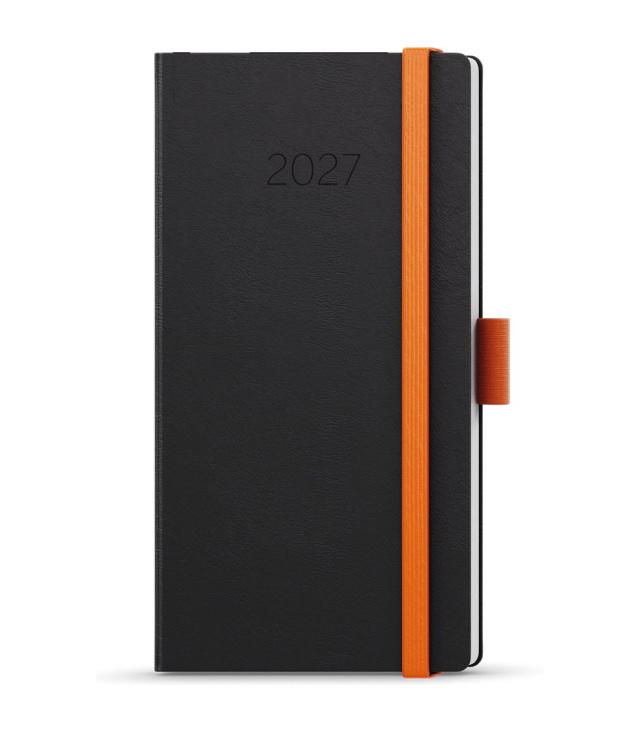 Diář týdenní kapesní - Jakub - Nora - černá, oranžová 2027, Kalendárium: měsíční fáze, roční období, letní a zimní čas, znamení zvěrokruhu, řádkový přehled 2 měsíců, dny a měsíce v 4 jazycích - CS, SK, EN, DE, mezinárodní svátky: CZ, SK, A, D, PL, H, GB, E, F, I, UA; Informační stránky: osobní údaje, přehledný kalendář aktuálního roku a následujícího roku, měsíční plánování aktuálního roku, plán dovolených aktuálního roku, jmenný seznam CZ/SK, mezinárodní svátky, roční plánovací kalendář CZ aktuálního roku, místo pro poznámky; Popis: Neobyčejný týdenní diář s matným povrchem ze strukturovaného materiálu s oranžovou gumičkou a poutkem. Je vyráběný v kapesním formátu, má velký prostor pro poznámky a plánování. s kalendáriem CZ, SK, EN, DE; české a slovenské týdenní jmenné /CZ + SK weekly/CZ + SK wöchentlich