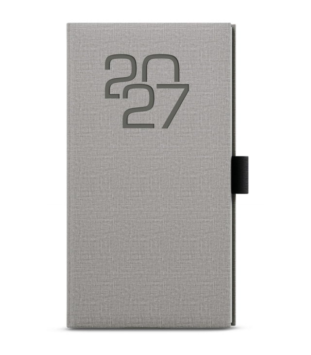 Diář týdenní kapesní -Jakub - Fabric - šedá 2027, Kalendárium: měsíční fáze, roční období, letní a zimní čas, znamení zvěrokruhu, řádkový přehled 2 měsíců, dny a měsíce v 4 jazycích - CS, SK, EN, DE, mezinárodní svátky: CZ, SK, A, D, PL, H, GB, E, F, I, UA; Informační stránky: osobní údaje, přehledný kalendář aktuálního roku a následujícího roku, měsíční plánování aktuálního roku, plán dovolených aktuálního roku, jmenný seznam CZ/SK, mezinárodní svátky, roční plánovací kalendář CZ aktuálního roku, místo pro poznámky; Popis: Kapesní týdenní diář z příjemného materiálu v šedé barvě a s moderní ražbou roku. Trendy a praktický doplněk do každé kapsy. Diář má velký prostor pro poznámky a plánování. s kalendáriem CZ, SK, EN, DE; české a slovenské týdenní jmenné /CZ + SK weekly/CZ + SK wöchentlich