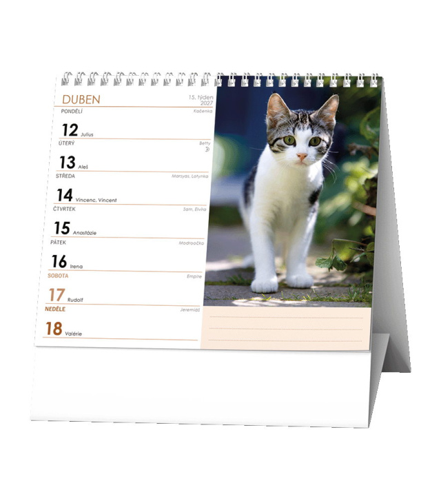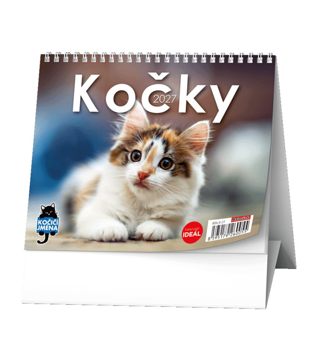 Stolní kalendář IDEÁL - Kočky /s kočičími jmény/ 2027, Kalendárium: měsíční fáze, roční období, letní a zimní čas, prostor na poznámky, kočičí jména; Informační stránky: státní svátky, ostatní svátky a významné dny, tabulkový kalendář aktuálního a nadcházejícího roku, místo na poznámky; Popis: Ideální kalendář za ideální cenu - s týdenním kalendáriem, v praktickém formátu pro všechny milovníky koček. s kalendáriem České týdenní jmenné + kočičí jména /CZ weekly/CZ wöchentlich