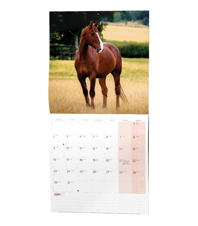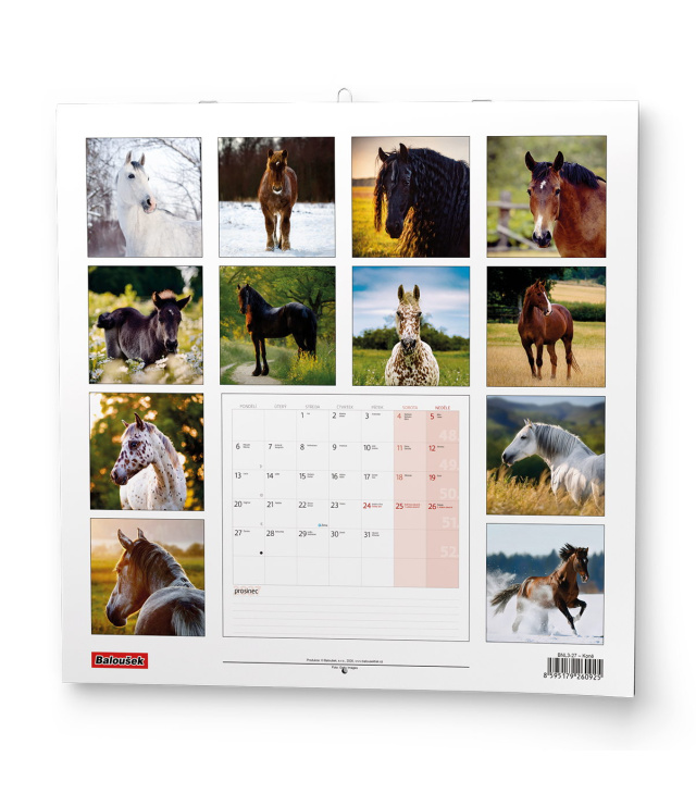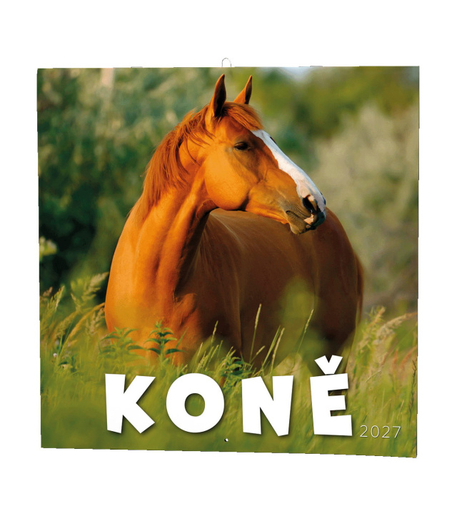 Nástěnný kalendář poznámkový Koně 2027, Kalendárium: poznámkové kalendárium se státními svátky, měsíční fáze, roční období, letní a zimní čas, místo na poznámky; Informační stránky: tabulkový kalendář aktuálního roku a následujícího roku, místo na poznámky; Popis: Nástěnný kalendář s měsíčním kalendáriem, v moderním formátu LP desky. Je věnován všem milovníkům koní. s kalendáriem České měsíční jmenné / monthly CZ with CZ names / monatlich CZ mit dem CZ Namen